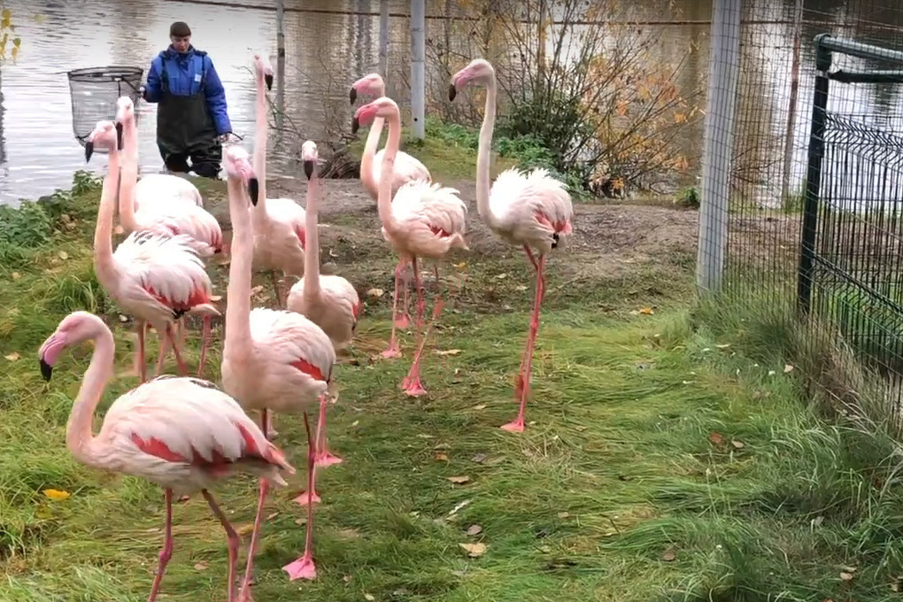 В зимние теплые вольеры отправились фламинго. Посетители смогут увидеть зимой этих птиц. Но только через панорамное стекло  стеклянного вольера.