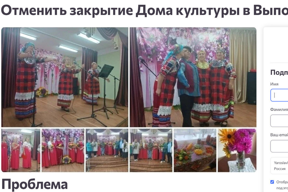 «Это учреждение уже многие годы является сердцем и душой нашей малой Родины, местом, где живет и процветает культура. Дом культуры в Выползово — это уникальная площадка, где проходят репетиции и выступления артистов всех возрастов. Здесь, среди друзей и единомышленников, свои первые шаги в искусстве делают дети, а пожилые люди находят отдушину и сохраняют жизнерадостность. С закрытием Дома культуры мы потеряем не только сцену, но и библиотеку и музей, которые создавались несколькими поколениями наших семей, вкладывавших сюда душу и сердце», - взывают жители Левобережья.