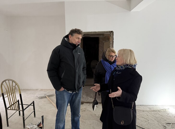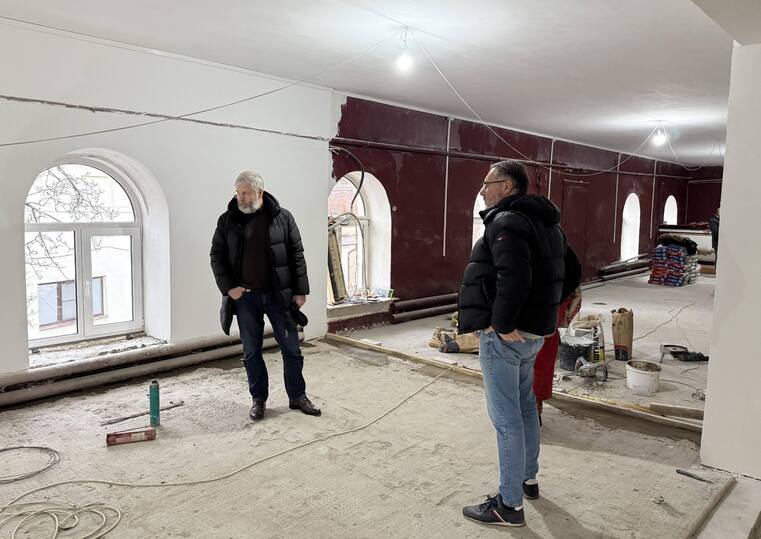 После церемонии открытия памятника участники отправились на площадку будущего «Ваксман-центра». Сейчас здесь ведутся ремонтные работы: помещение готовят к чистовой отделке.