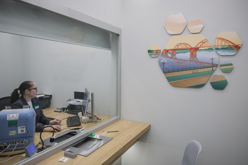 Изюминкой офиса является оформление. В интерьерах использованы декоративные панно с видами достопримечательностей Рыбинска, созданными с использованием искусственного интеллекта: изображение машиностроителя на Волжской набережной и вид на Рыбинский мост.