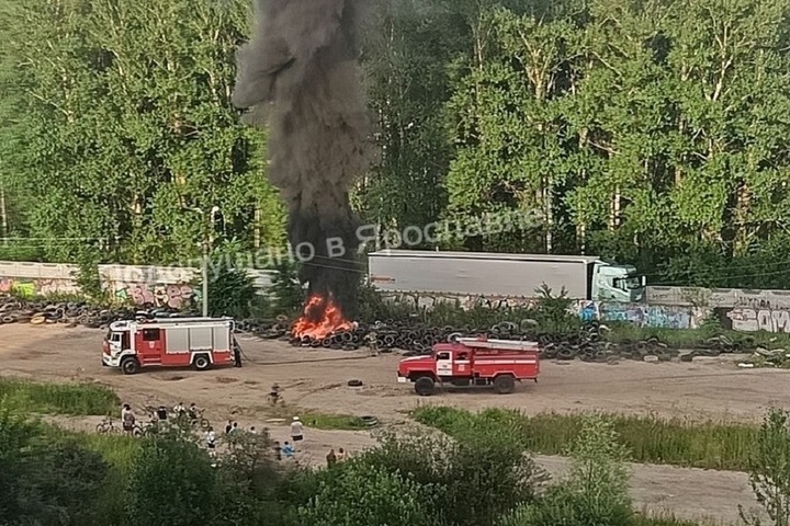 В Ярославле пожарным пришлось тушить гору автомобильных покрышек. Столб черного дыма был замечен жителями Дзержинского района  около 19 часов. как удалось выяснить, загорелась гора старых автомобильных покрышек у Дзержинского рынка.