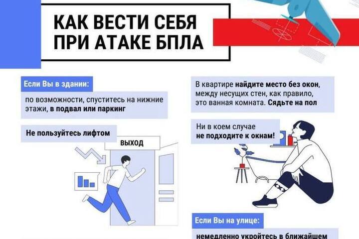 «Соблюдайте спокойствие. Если вы находитесь на улице – покиньте открытые участки, постарайтесь укрыться в ближайших зданиях. В помещениях важно зашторить окна плотными занавесками или опустить жалюзи, отойти от окон на безопасное расстояние и стараться находиться в комнатах со сплошными стенами», - уточнил правила поведения в период беспилотной опасности губернатор.