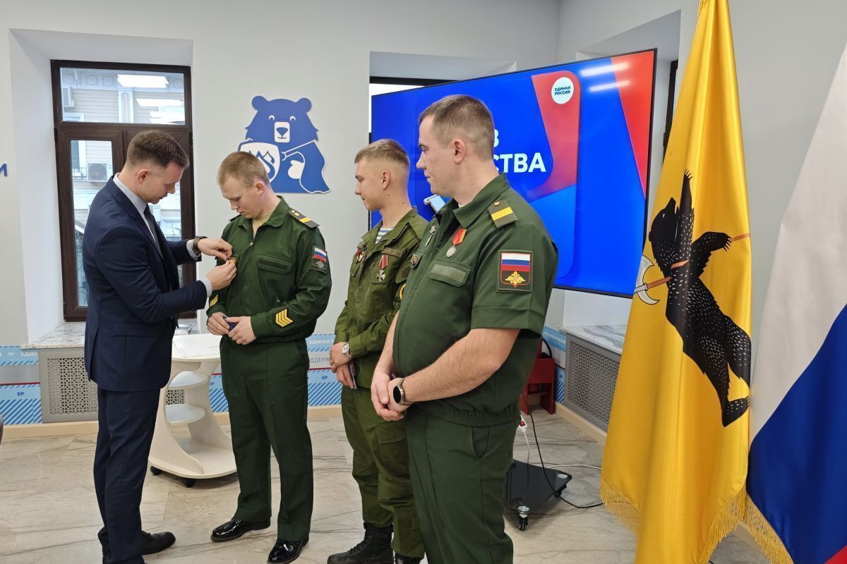 Секретарь Ярославского регионального отделения «Единой России» Евгений Чуркин вручил партийные билеты и значки ветеранам специальной военной операции Артему Цареву, Антону Шишко и Даниилу Гуляеву.