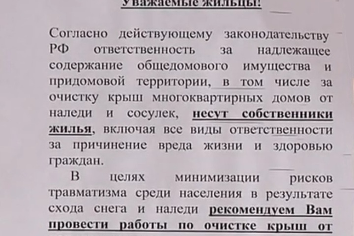При этом писавшие объявления граждане заботливо добавляют, что самостоятельно это делать опасно и необходимо нанять подрядную организацию. Также отмечается, что в случае схода с крыши снега и травмирования людей, отвечать будут собственники квартир.