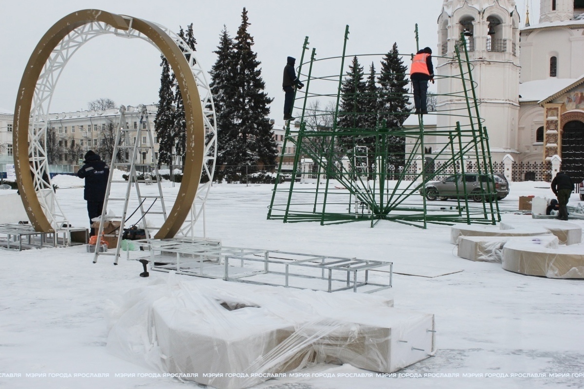 В Ярославле подрядная организация приступила к монтажу новогодней елки на Советской площади. Рабочие приступили к сбору каркаса елки. Потом на каркасе будут закреплены ветки и игрушки.