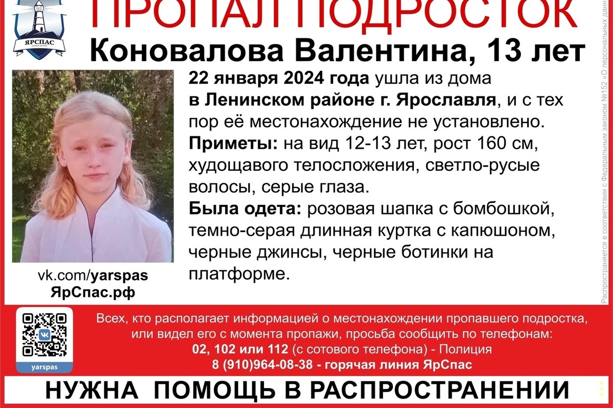 Если вы видели юную ярославну или знаете, где она находиться, просьба позвонить по телефону "ЯрСпаса" 8-910-964-08-38 или 112