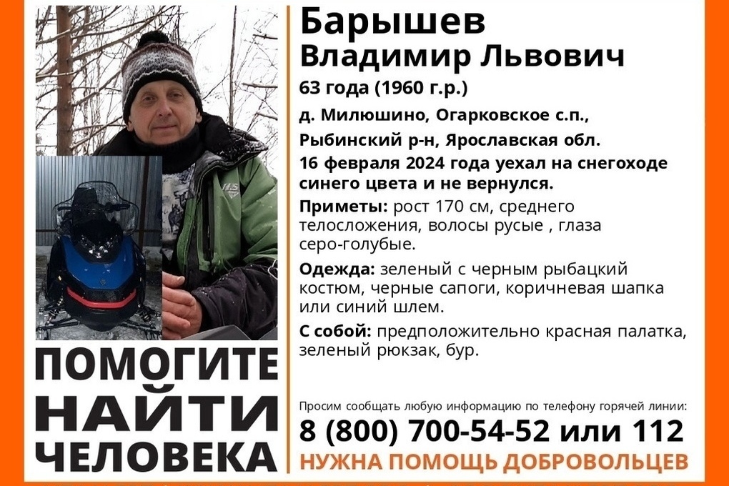 63-летний Владимир Барышев отправился рыбачить 16 февраля. В качестве средства передвижения по льду избрал снегоход. Есть сведения о том, что после выезда из дома он заехал в гости к друзьям. Но потом покинул компанию рыболовов и направился искать клевое место поближе к берегу. И пропал.