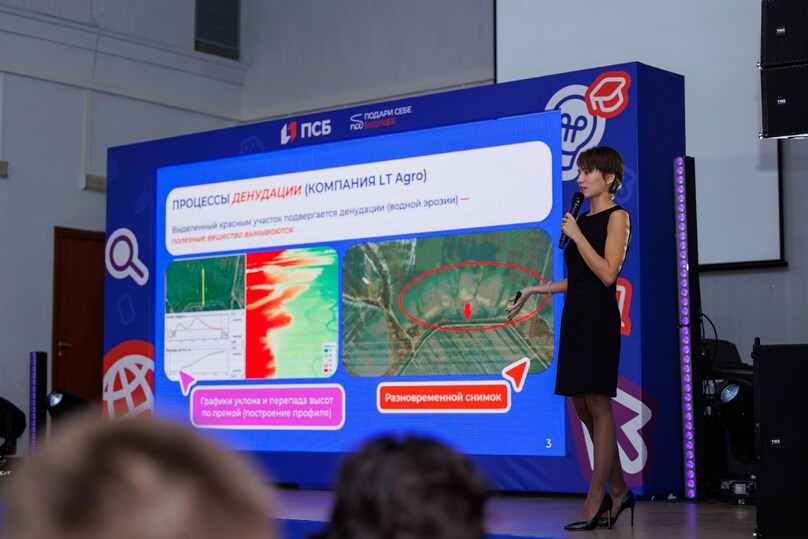 На форуме студенты узнали, что свой бизнес-проект можно начать с нуля еще в студенческие годы и постепенно «расти», принимая участие в акселераторах и получая поддержку от разных конкурсных программ. Об этом была история Елены Константиновой, победителя Forbes 30 до 30 (2023 г.) в номинации «Наука и технологии». На выступлении она рассказала, как на втором курсе института основала стартап Aerospace-Agro, где использовали спутниковые снимки, математические модели и искусственный интеллект для диагностики сельскохозяйственных угодий.