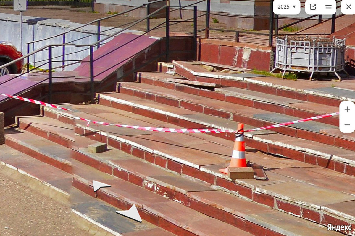В Ярославле в ужасающем состоянии находится крыльцо здания администрации Дзержинского района. Некогда красивое и парадное, облицованное плитками красного гранита, оно уже несколько лет подряд являет собой ужасающее зрелище. Плитки развалились, основание под ними раскрошилось. Ходить по лестнице стало опасно. Сейчас пробраться в здание можно по относительно целой части шириной в метр. По ней ходят чиновники и посетители здания.