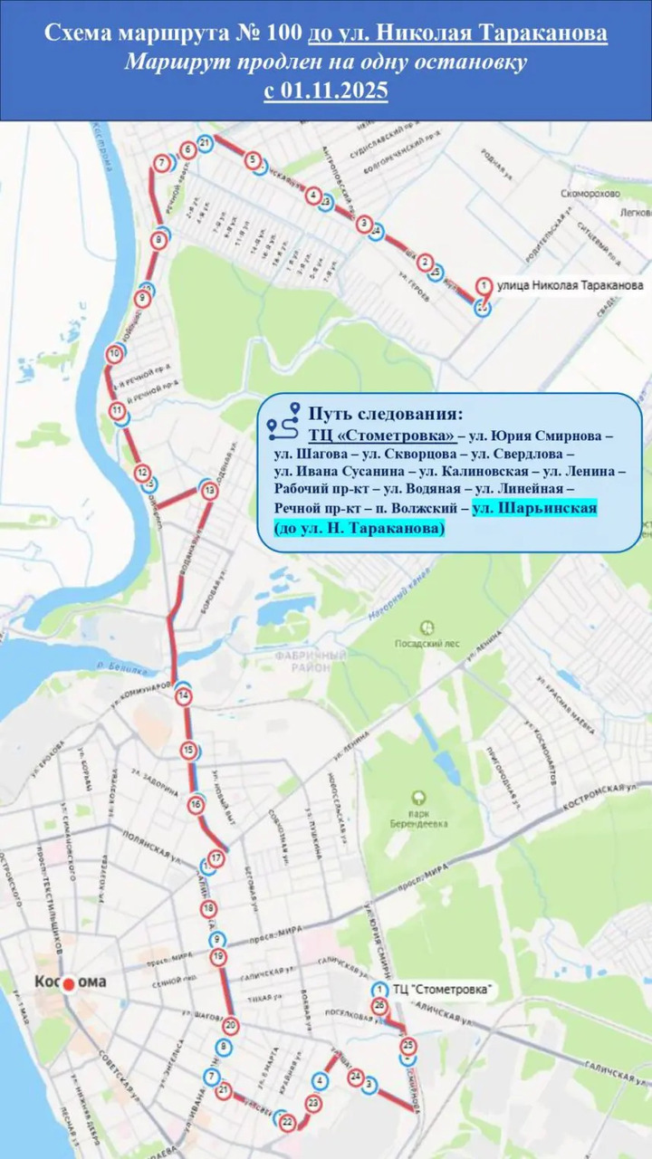 ОГКУ «Организатор перевозок Костромской области» сообщает, что маршрут движения городского автобуса №100 существенно удлинится: теперь он будет проходить по Шарьинской улице до разворотного павильона, установленного на площади в районе улицы Николая Тараканова.