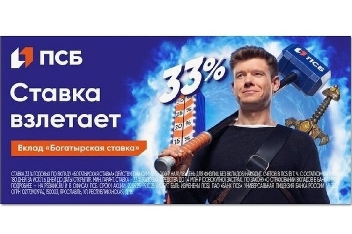 *Ставка 33% годовых по вкладу «Богатырская ставка» действует для суммы 50 000 руб. на срок 91, 181 дней для новых вкладчиков, не имевших в банке действующих срочных вкладов и (или) накопительных счетов (в т. ч. с нулевыми остатками) в течение 180 дней, предшествующих дате открытия вклада «Богатырская ставка» (за исключением даты открытия вклада «Богатырская ставка» и 6 календарных дней предшествующих дате открытия вклада «Богатырская ставка»), а также срочных вкладов и (или) накопительных счетов, закрытых в дату открытия вклада «Богатырская ставка» и в течение 180 дней, предшествующих дате открытия вклада «Богатырская ставка». Выплата процентов ежемесячно на иной счет клиента, открытый в банке. Минимальная гарантированная ставка — 33% годовых. Денежные средства по совокупности вкладов и остатков на счетах физлиц застрахованы в пределах 1,4 млн руб. в соответствии с федеральным законом «О страховании вкладов в банках Российской Федерации». Подробная информация — на psbank.ru, по телефону 8 800 333 78 90 (круглосуточно, звонок по России бесплатный) или в офисах банка. Информация актуальна на 01.11.2025.