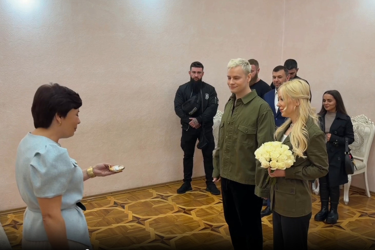 Молодожены вступили в брак в Донецке. Самый известный блондин и самая известная блондинка российских масс-медиа на семейном торжестве были одеты в скромные френчи цвета хаки. Гостей было немного.