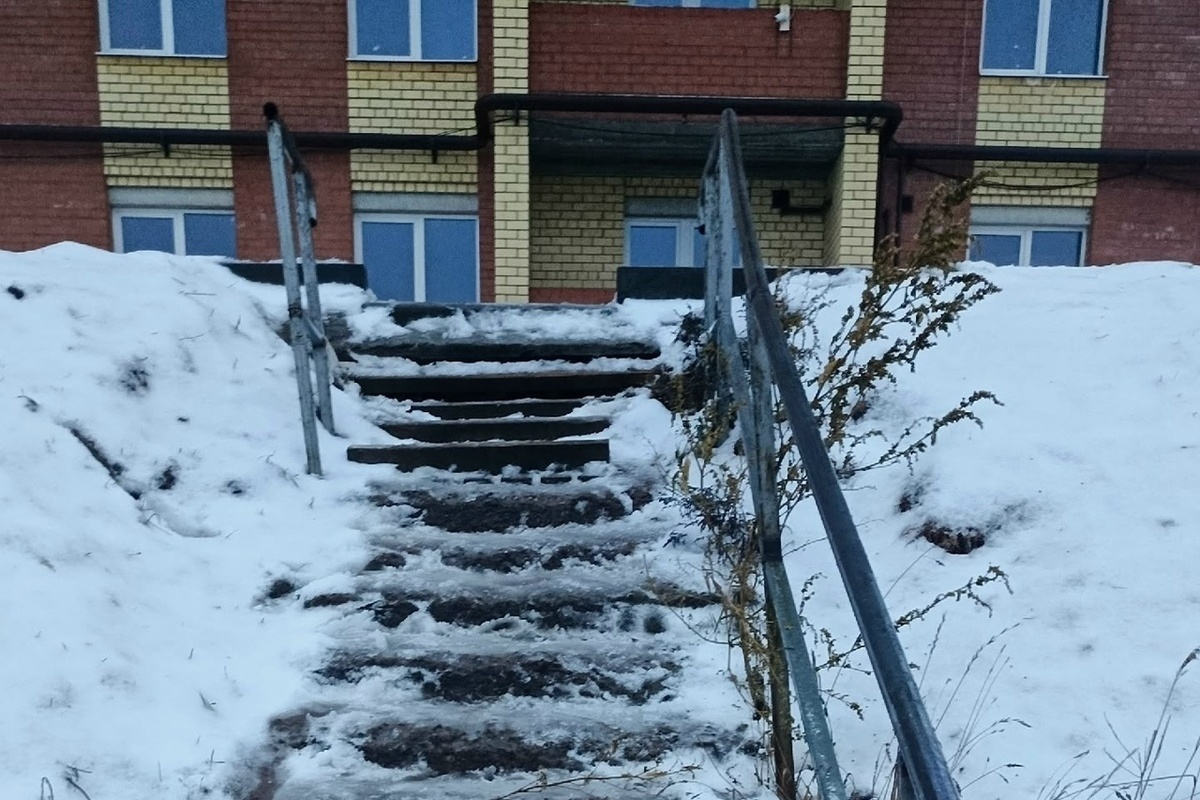 Жители поселка Красный Бор, чтобы попасть в магазины Глобус и Лемана Про, должны преодолеть спуск, представляющий собой в настоящее время ступеньки, полностью скрытые снегом и льдом.