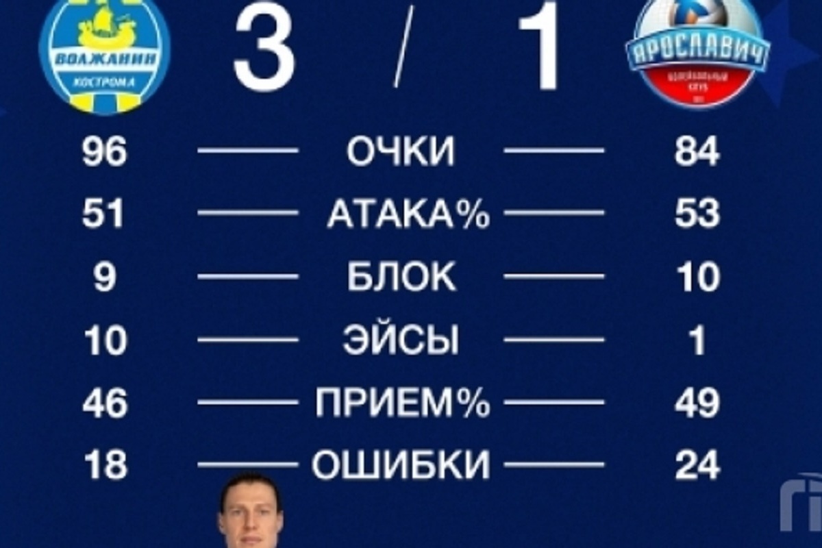 «В сегодняшней встрече ярославцы были лучше в игре на блоке (10 результативных действий против 9 очков у костромичей), но у хозяев отлично летела подача – 10 эйсов, что и предопределило исход поединка» - сообщает релиз клуба.
