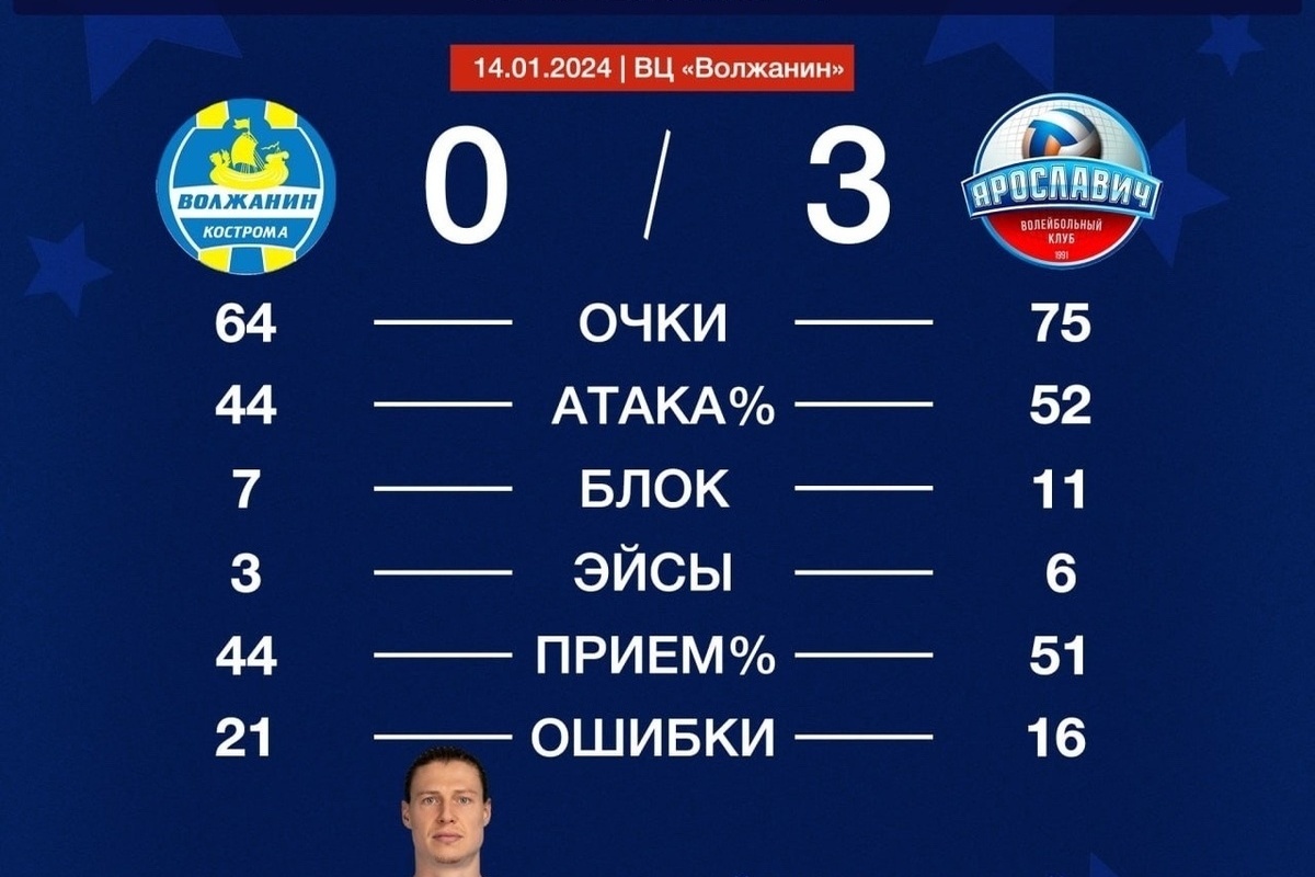 Как сообщает пресс-служба клуба, в течение матча 17 очков набрал самый результативный игрок в составе «Ярославича» Артем Хрусталев, 5 эйсов на счету Артема Хрусталева, 3 очка на блоке заработал Павел Николаенко.