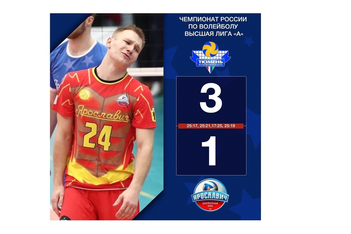 Во втором поединке 4 тура Финала за 1-8 места Высшей лиги «А» волейбольный клуб «Ярославич» не смог взять реванш у «Тюмени», уступив со счетом 1:3 (17:25, 21:25, 25:17, 19:25).